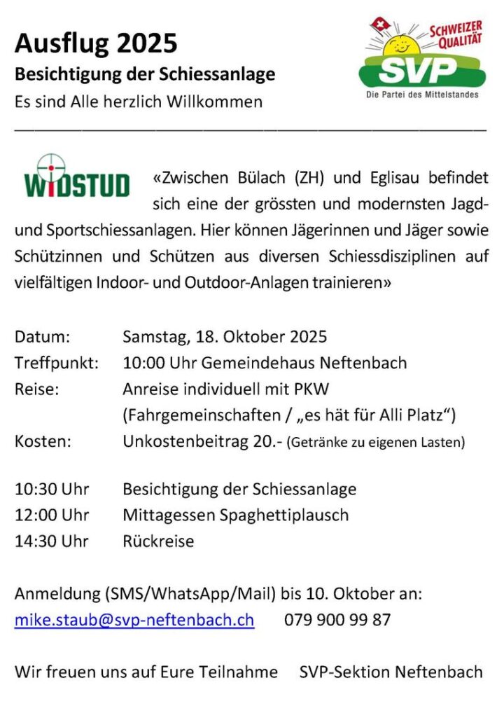 Anmeldung bis 10.10.2025 an mike.staub@svp-neftenbach.ch. Weitere Informationen entnehmen Sie dem Flyer.